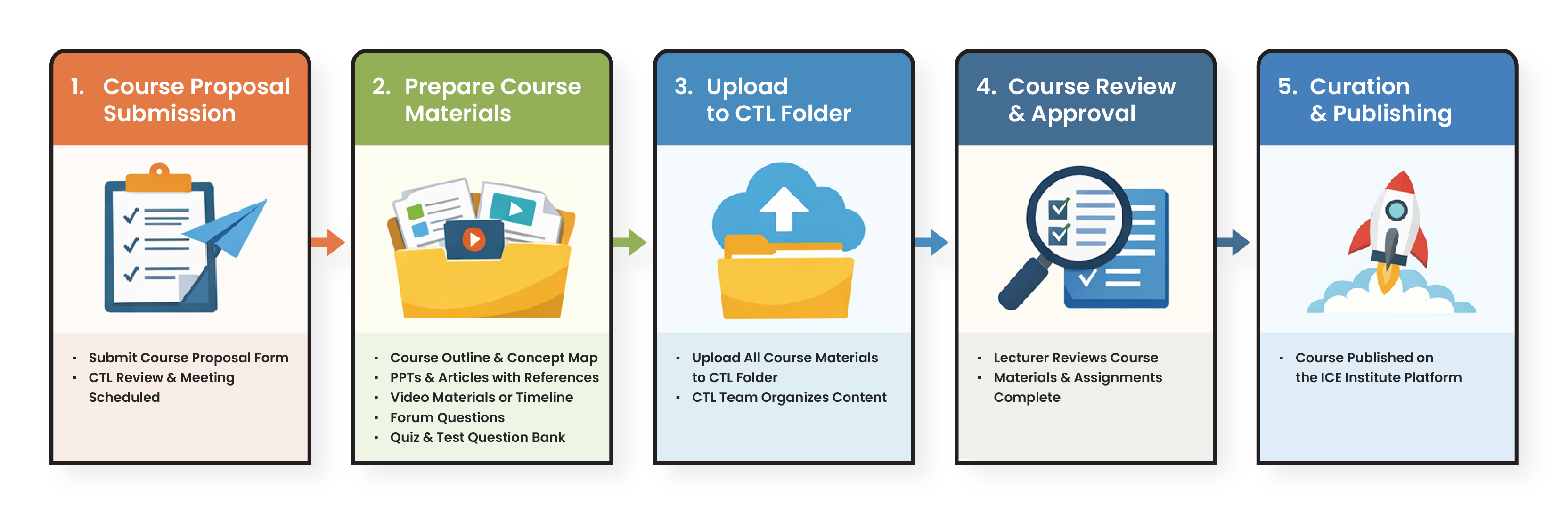 Upload all required items to the folder provided by the CTL team. The team will assist in uploading and organizing the materials on the ICE Institute platform.